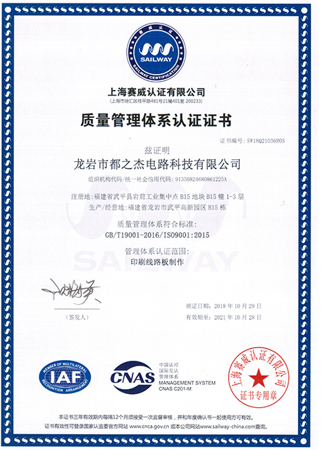 自1997年成立以來,都之杰已經獲得ROHS產品認證,各項技術指標達到國家先進水平,質量和信譽是企業的生命,我們一直以來持續不斷改善產品的質量,以質量取勝市場,提高公司的信譽度。多年來憑優良的產品質量、準時快捷的供貨和周到細致的服務,深得國內外客戶的好評。我們已經獲得良好的聲譽和客戶的信任,并逐漸成為客戶可信賴的、能長期合作的印刷線路板戰略合作供應商。我們堅持向國內外先進企業學習并不斷提升自主創新。公司擁有經驗豐富及穩定的團隊,視質量為企業生命,嚴格推行ISO9001質量管理體系,符合ROHS標準,并獲得了UL安全認證、TS16949和CQC認證。